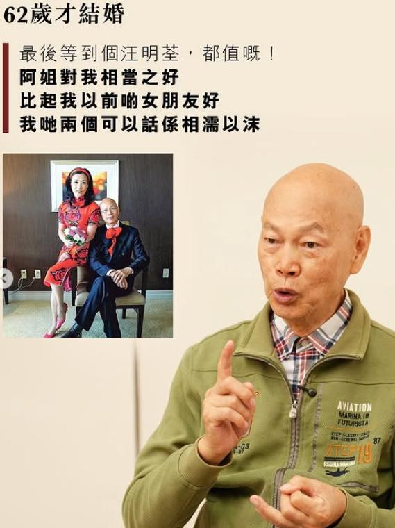 所以我到62岁才结婚,又没有孩子……(港媒询问他值不值?)最后等到汪明荃,也值得,阿姐对我相当好,比起我以前的女朋友好,我们两个可以说是相濡以沫。而且她的名气帮到我,如果我娶个小家碧玉,她不能帮助我发展,可能还会拖累我。”