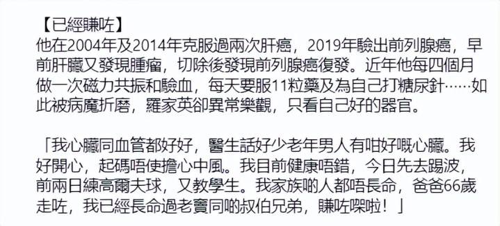 据悉,罗家英在2004年及2014年克服过两次肝癌,2019年验出前列腺癌,早前肝脏又发现肿瘤,切除后发现前列腺癌复发。近年他每四个月做一次磁共振和验血,每天要服11粒药及为自己打糖尿针……如此被病魔折磨,罗家英却异常乐观,只看自己好的器官。