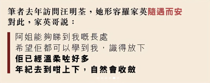 港媒称去年访问汪明荃的时候,她便如此形容罗家英:“他是一个很容易相处的人,大事很清楚,只是小事糊涂。他这个人随遇而安,遇到困难也不会怕,睡觉一睡就睡着。”