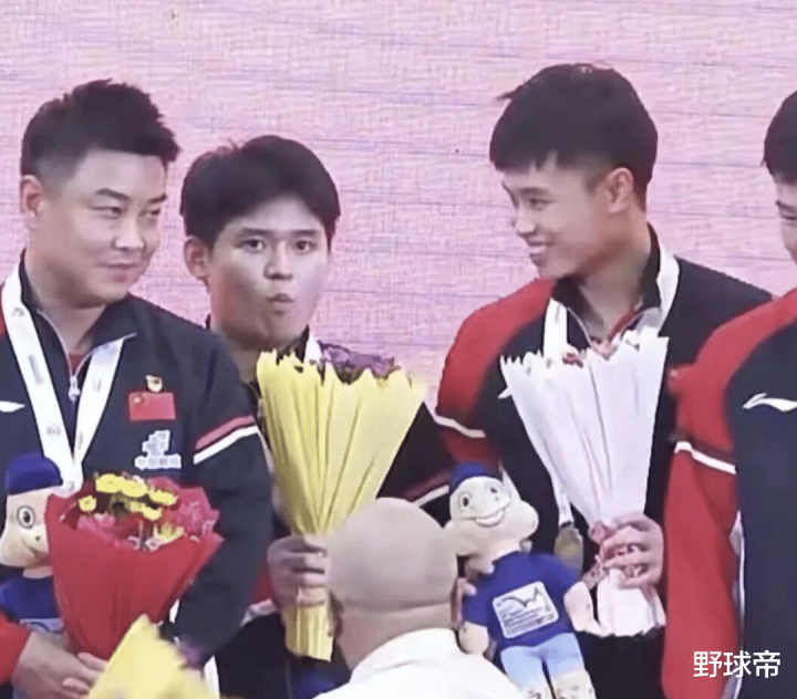 颁奖仪式上,林诗栋接过主办方送的鲜花后习惯性轻嗅,随即眉头紧锁、表情扭曲,直呼“好臭啊”,还拉队友周启豪一起闻臭。