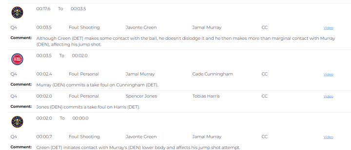 ——比赛最后3.5秒,活塞底线发球,掘金球员贾马尔-默里对活塞球员凯德-坎宁安的无球跑动完成一次故意犯规;开球仅0.4秒后,掘金球员斯宾塞-琼斯又对活塞的托拜厄斯-哈里斯的无球跑动完成一次故意犯规,这两次判罚均被复核认定为漏判。