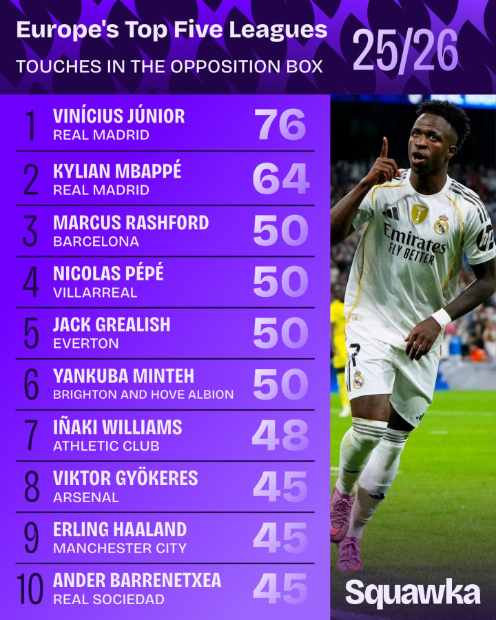虎扑10月16日讯Squawka数据统计本赛季至今五大联赛对方禁区触球榜,维尼修斯第一,姆巴佩第二,拉什福德、格拉利什、佩佩等人并列第三。