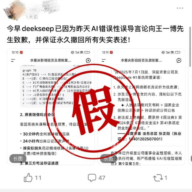 事情进展到这一步,谁也没想到还出了一个大插曲:昨天,全网出现了一篇《演员王一博案,判了》的文章,表示针对这件事,DeepSeek出了一份官方道歉。然而,这篇全网传播的文章没有任何官方来源。DeepSeek也从未就此事发表过任何声明。