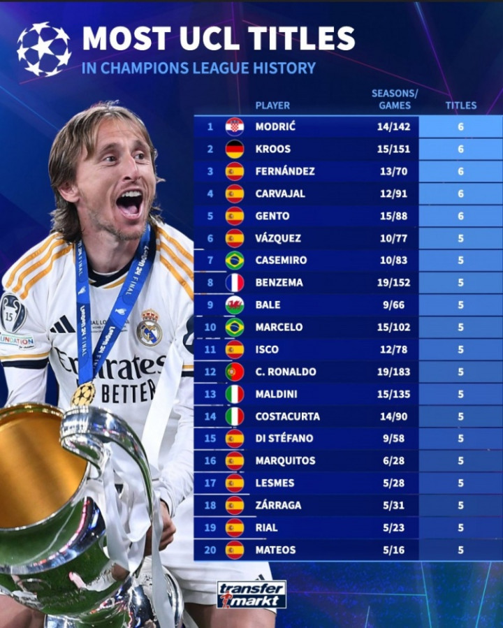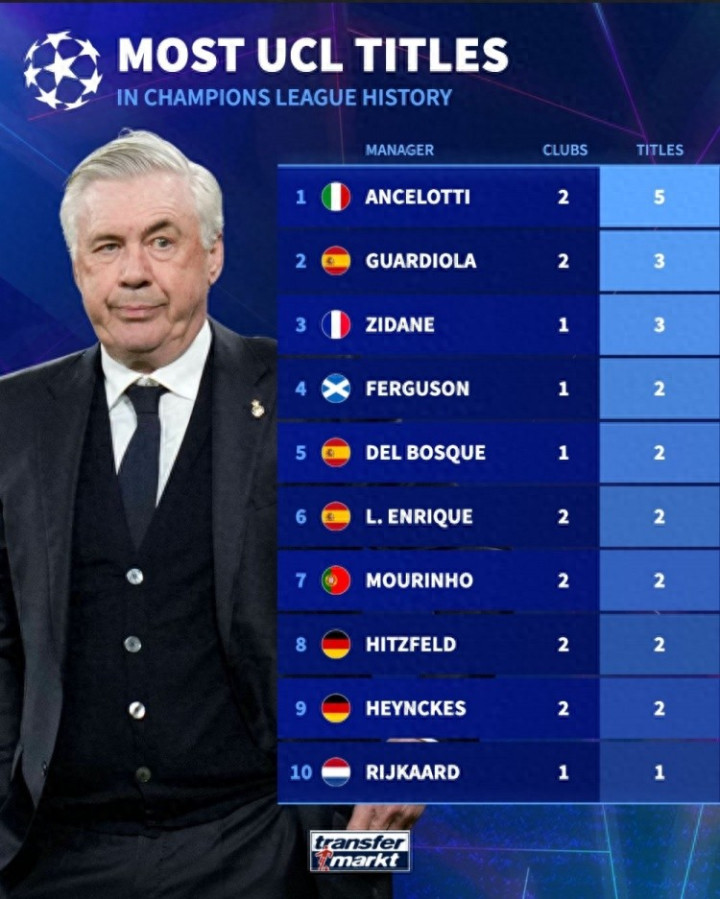 直播吧9月16日讯 德国转会市场统计了教练、球员夺得欧冠的次数,并分别列出榜单,教练之中安切洛蒂5冠居首,球员之中莫德里奇、克罗斯、纳乔、卡瓦哈尔、亨托6冠最多。