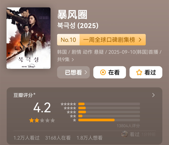 对此,中国观众对此事的反应既迅速又坚决,《暴风圈》在豆瓣平台的评分变化颇具代表性,该剧开分时曾达到7.1分,但随着争议内容被陆续发现,评分一路暴跌至4.2分。