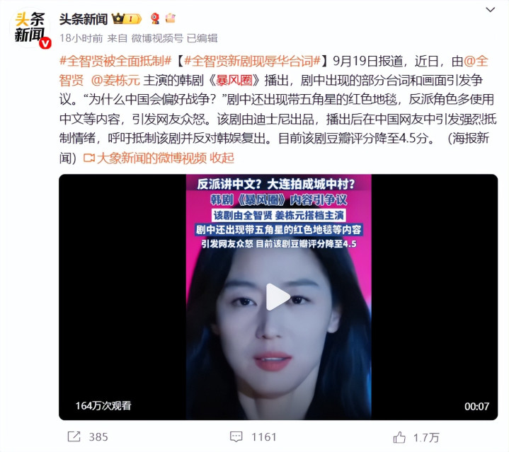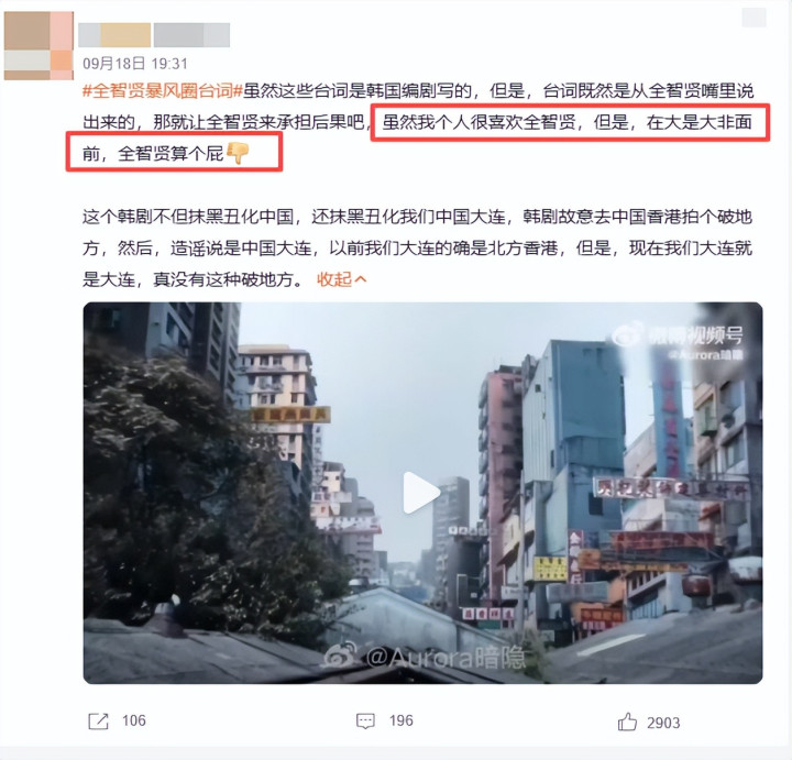 还有一些原本是全智贤的粉丝,都表示“在大是大非面前不会容忍”,虽然是制片方写出来的剧情,但台词是由全智贤说的,这就足以让中国网友对其表达愤怒了。