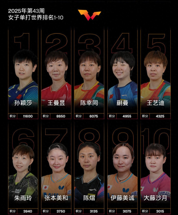 国际乒联于10月21日公布了2025年第43周的世界排名,中国女乒的统治力达到了令人惊叹的高度,孙颖莎以11600分连续第171周稳坐世界第一宝座,与王曼昱、陈幸同、蒯曼、王艺迪一起包揽了女单前五名,这是中国乒乓球女队实力的最佳证明,也是2025年赛季以来她们在国际赛场上持续展现统治力的缩影