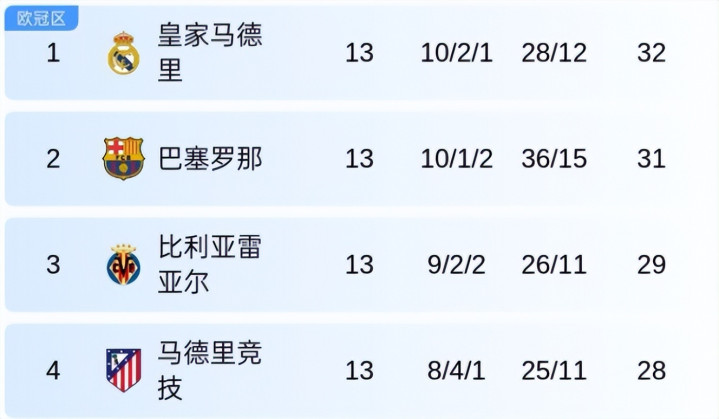 2、皇马虽然继续领跑积分榜,但是优势只剩下一分,而且仅仅领先第4名马竞4分……